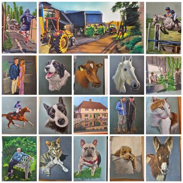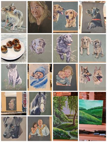 I generally like to work from photographs, and can make one picture by using several photos so it looks like everyone is together. The clearer the photograph the more detail I can do